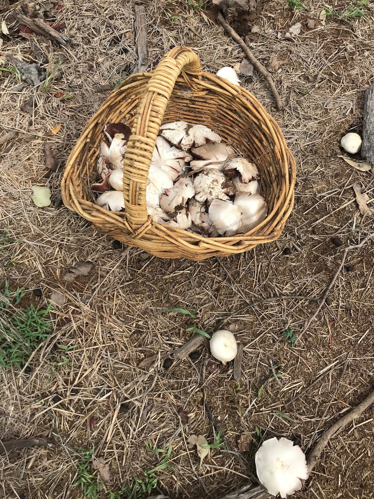 Kim out foraging in the pig paddocks. The pigs don't eat mushrooms, but they fertilise the paddocks nicely for growing mushrooms.
